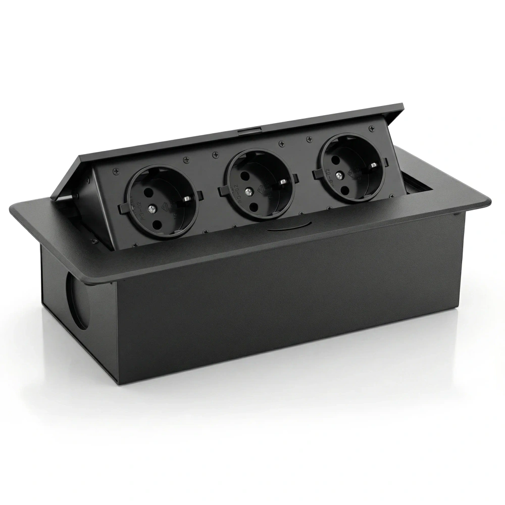Trijų įžemintų lizdų rinkinys korpuse, paslėptame stalviršyje