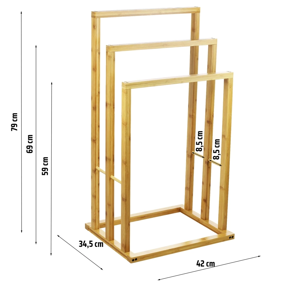 Stilinga bambukinė rankšluosčių kabykla su trimis skirtingo aukščio strypais yra puikus sprendimas vonios kambariui, virtuvei, skalbyklai ar miegamajam. Ačiū natūrali išvaizda ir kompaktiški matmenys tinka bet kokiam interjerui, tuo pačiu suteikiant optimalią erdvę rankšluosčiams ir kitai tekstilei džiovinti.