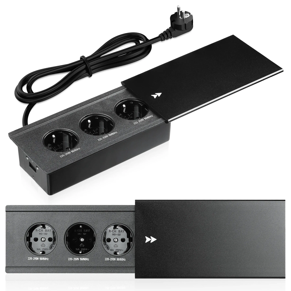 Tvirto korpuso, įleidžiamos konstrukcijos ir slankiojančio aliuminio dangtelio dėka lengvai pasieksite elektros tiekimą, o tuo pačiu išlaikysite tvarką ir estetiką ant stalviršio.