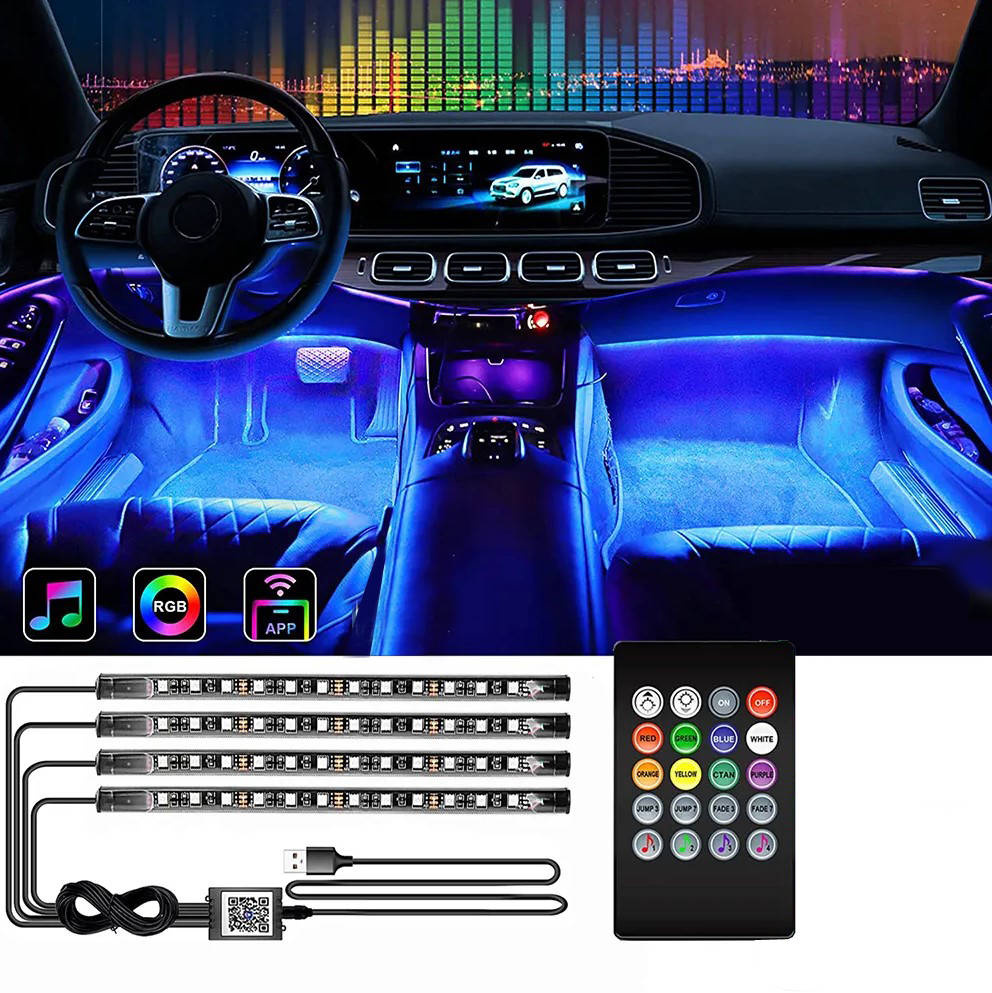 Iluminação LED RGB no interior do carro para tomada de isqueiro | 4x fita LED 12 diodos 5050 22cm | Controle remoto infravermelho | modos de música