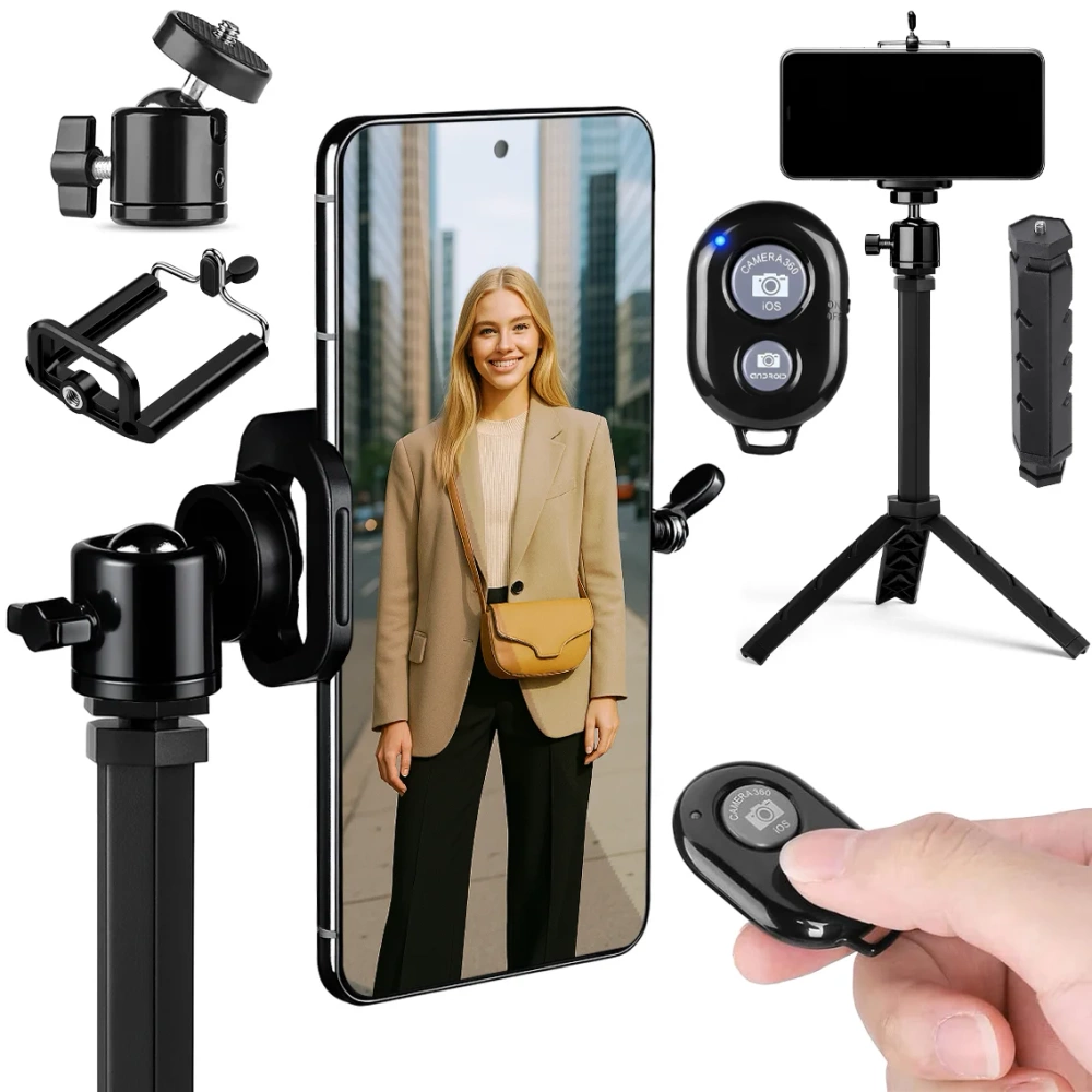 Kit de fotografia móvel – tripé com cabeça esférica, suporte para telefone e controle remoto Bluetooth para fotos, vídeos e transmissão ao vivo