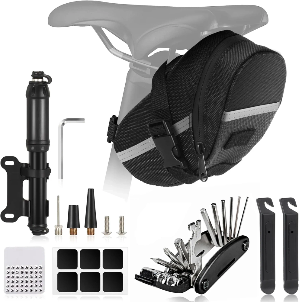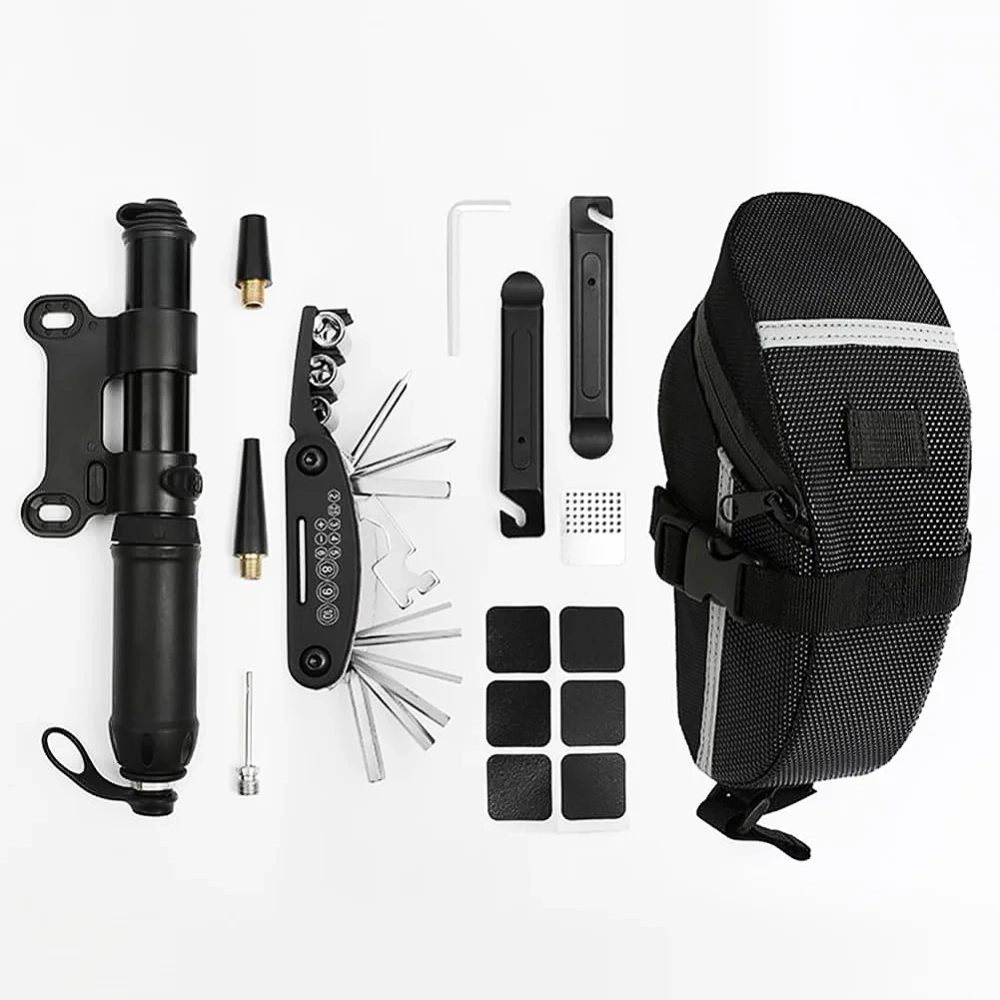 Pachetul compact combină o geantă de șa ușoară și impermeabilă, o unealtă multifuncțională 16 în 1, o mini-pompă fiabilă cu accesorii, pârghii de anvelope și petice, oferindu-vă tot ce aveți nevoie pentru următoarea aventură. echipament complet pentru reparații rapide și o călătorie confortabilă.