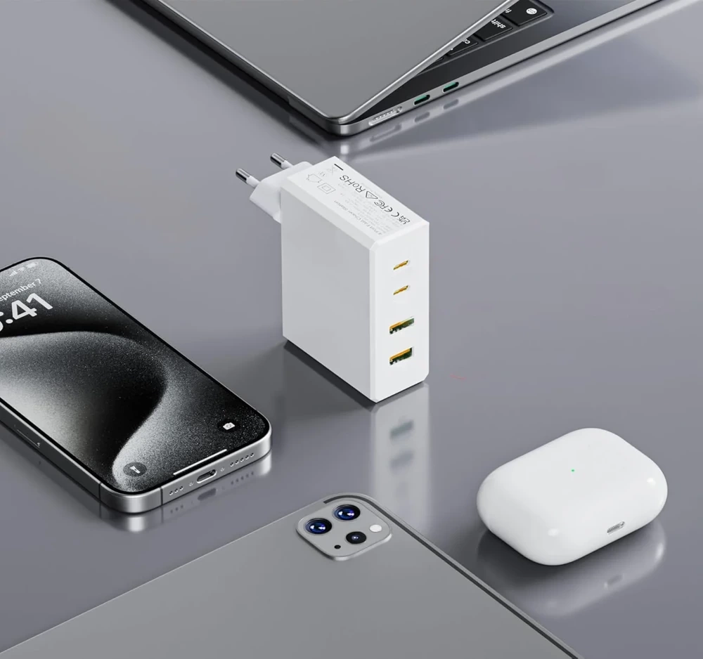 • -Výkonný 100W výkon a 4 porty -GaN technológia: menšia, ľahšia, efektívnejšia a efektívnejšia ako tradičné nabíjačky. -Univerzálna kompatibilita: Podpora PD 3.0, QC 3.0, PPS, SCP, FCP a ďalšie štandardy, ideálne pre väčšinu zariadení na trhu.