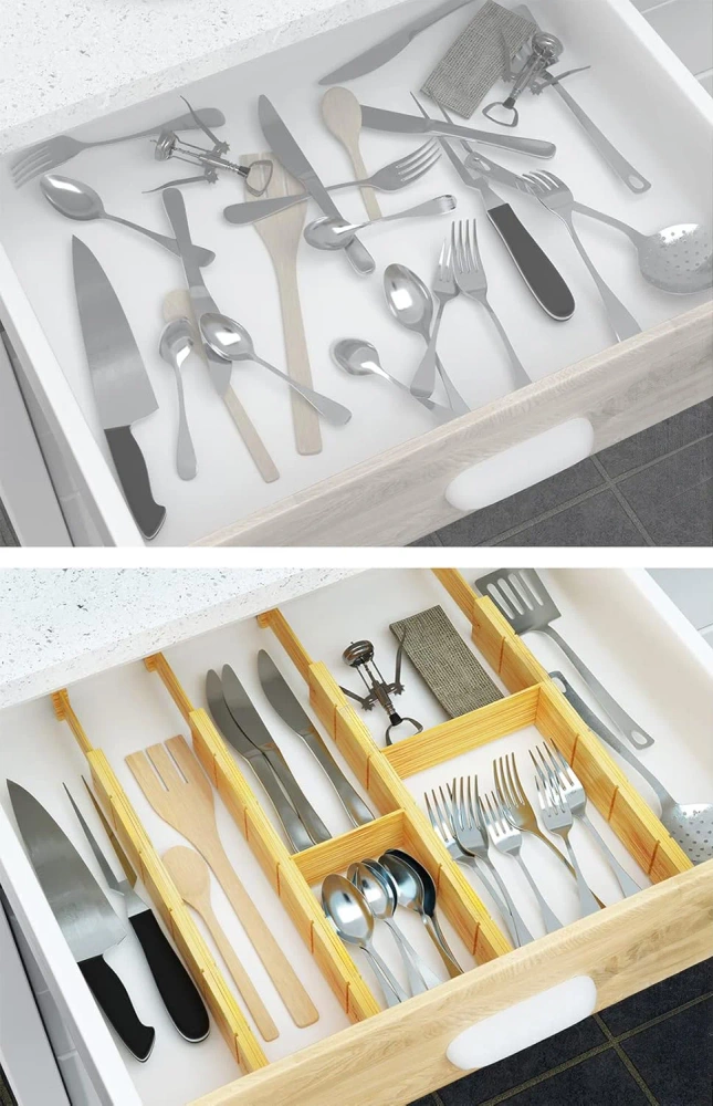 Gracias a su longitud ajustable, los separadores se adaptarán a la mayoría de los cajones estándar, ayudando a mantener el orden en la cocina, el dormitorio, el baño o la oficina.