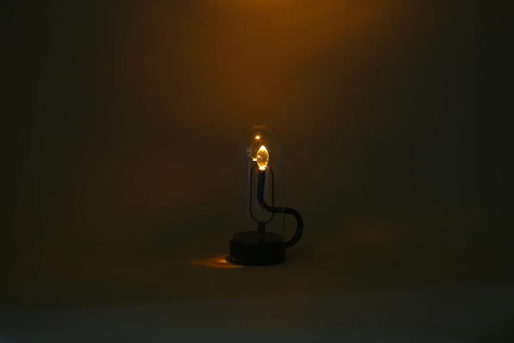 Лампа має маленьку лінзу, яка підсвічується світлодіодним світлом, розташований на металевій петлі. Виробляє тепле, мерехтливе сяйво схожий на свічку. Коли лампу вмикають, два магніти розсувають лінзу, змушуючи її коливатися крихітними постійними коливаннями, які слідують за цим. непередбачуваний ритм.