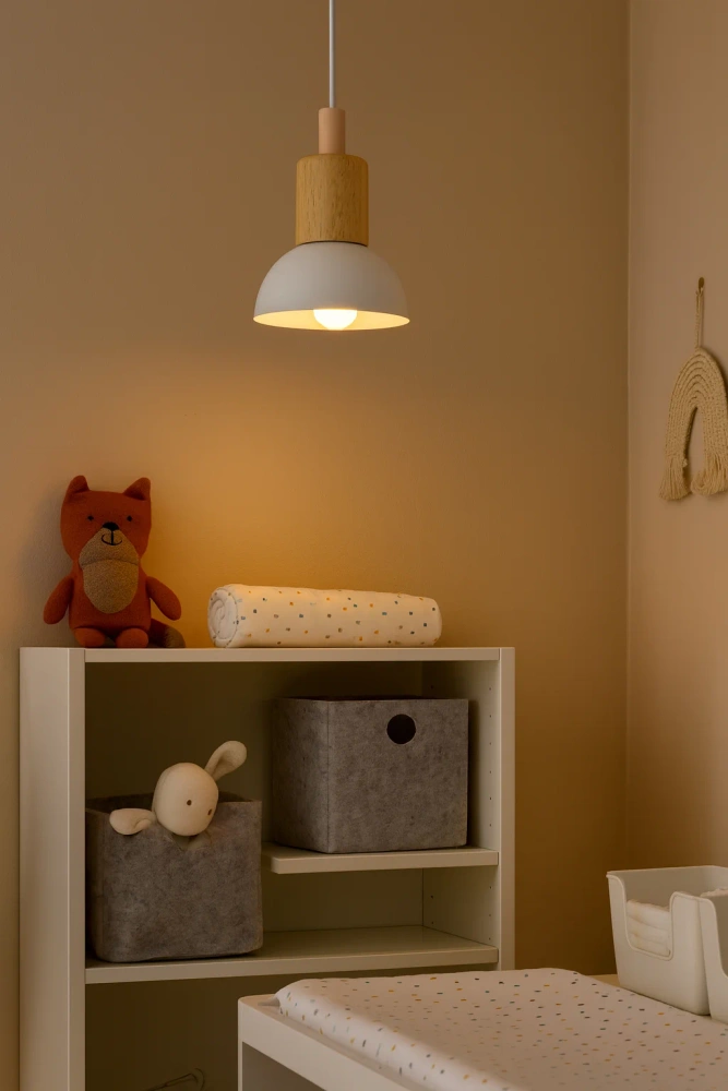 Стильна підвісна лампа з мінімалістичним дизайном поєднує матово-білий колір із натуральним деревом, створюючи теплу й затишну атмосферу у будь-якому інтер’єрі.