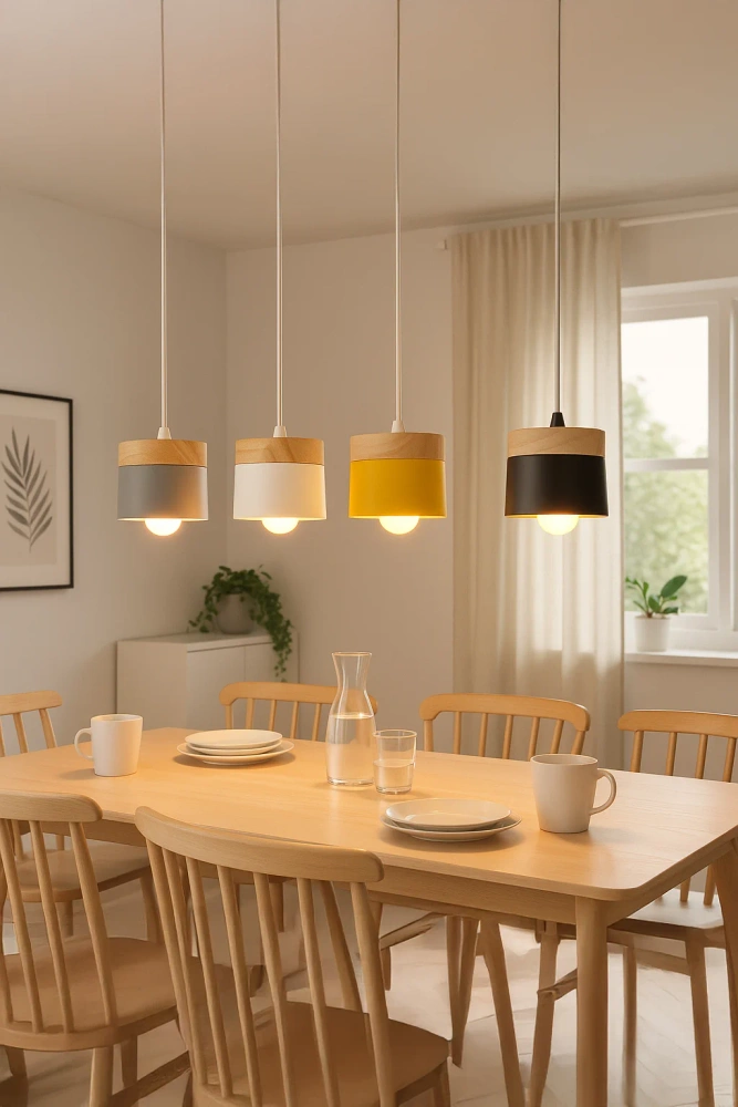 Стильна підвісна лампа з мінімалістичним дизайном поєднує матовий, теплий сірий колір з натуральним деревом, створюючи затишну атмосферу у будь-якому приміщенні.